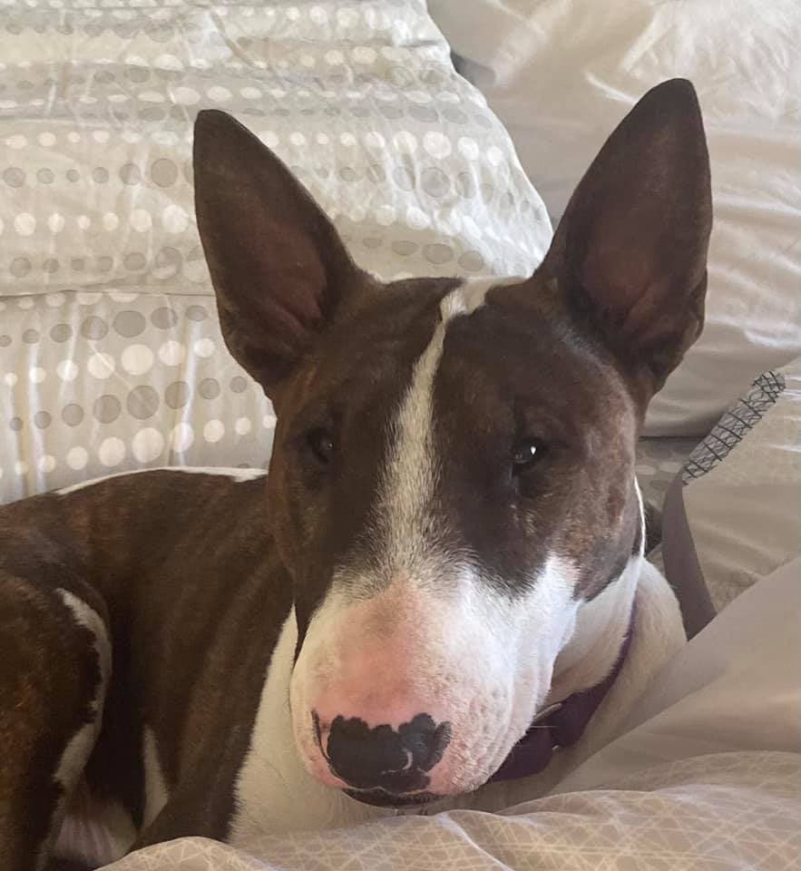 This is my sweet bull terrier, Claire. I rescued her at 7 months and she just turned 4 on August 6. She came trained to ring a bell at the door to go potty. She’s very clever and you will find her Facebook page under Clever Claire-Adopted — Liane Banse, Arlington
