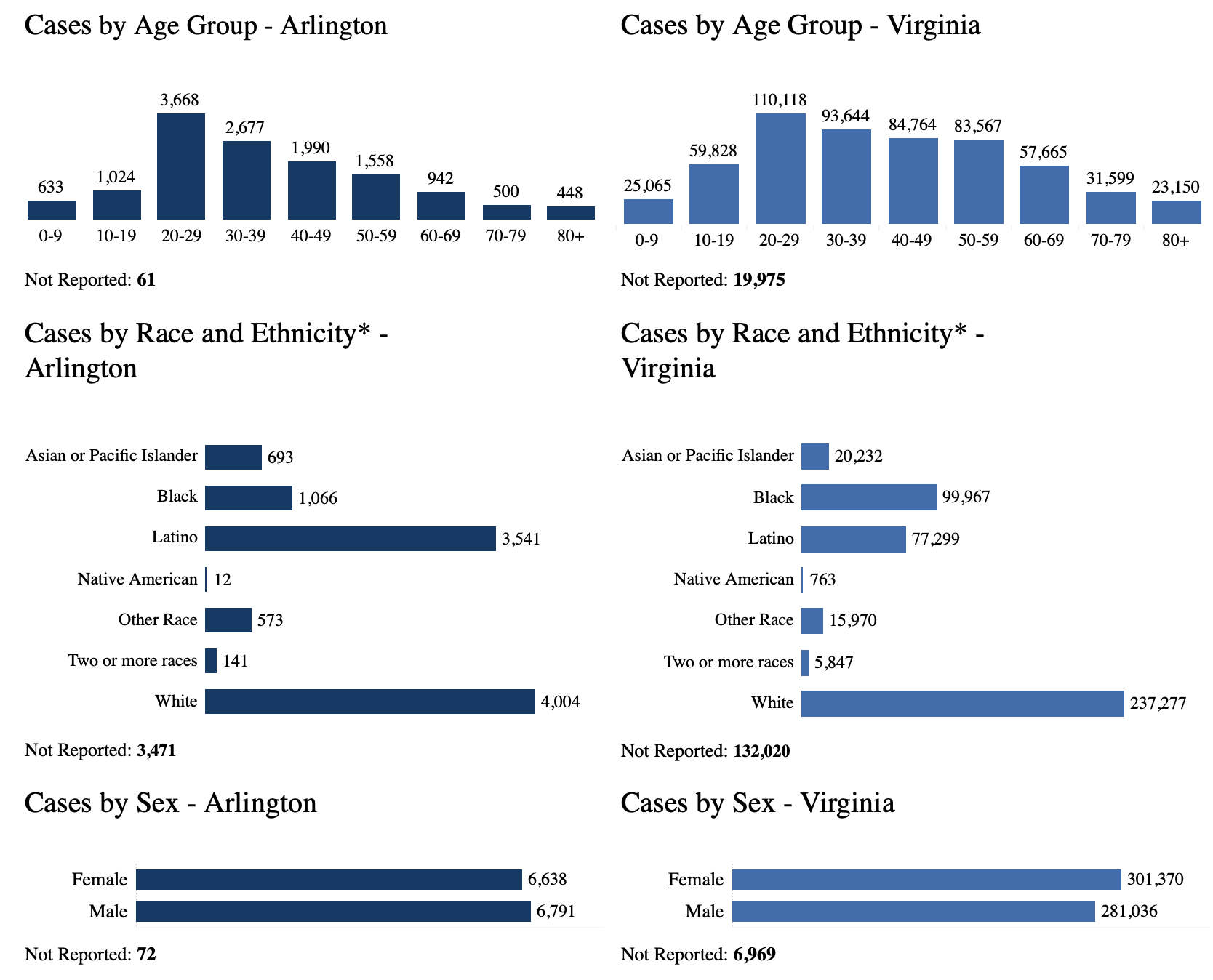 VDH breaks down the number of cases and deaths in Arlington by age, race and ethnicity. The breakdown by age is as follows: