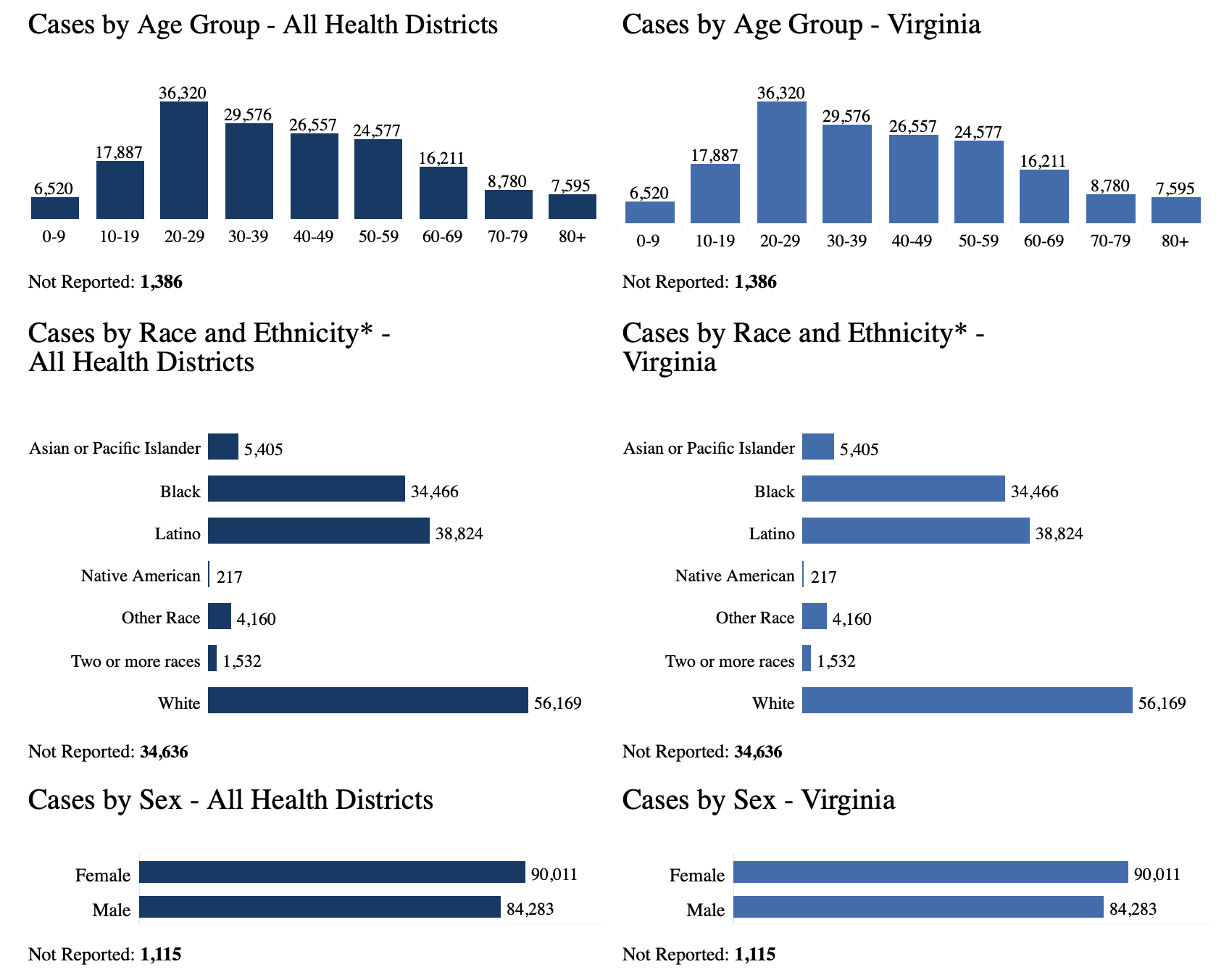 There have been 175,409 total cases statewide, according to data reported by the Virginia Department of Health. In Virginia, there have been 3,600 coronavirus-related deaths to date. There have been a total of 12,320 hospitalized COVID-19 patients.