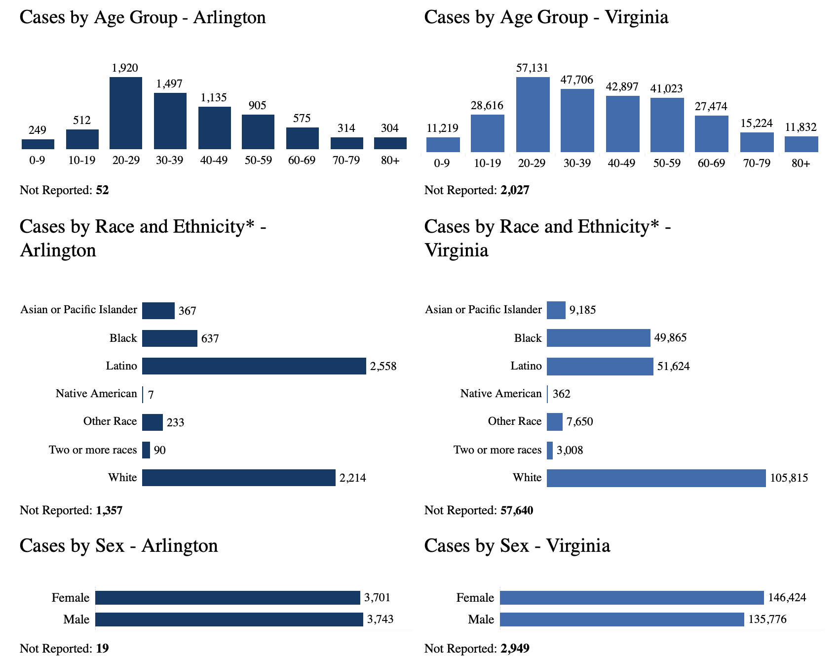VDH breaks down the number of cases and deaths in Arlington by age, race and ethnicity. The breakdown by age is as follows: