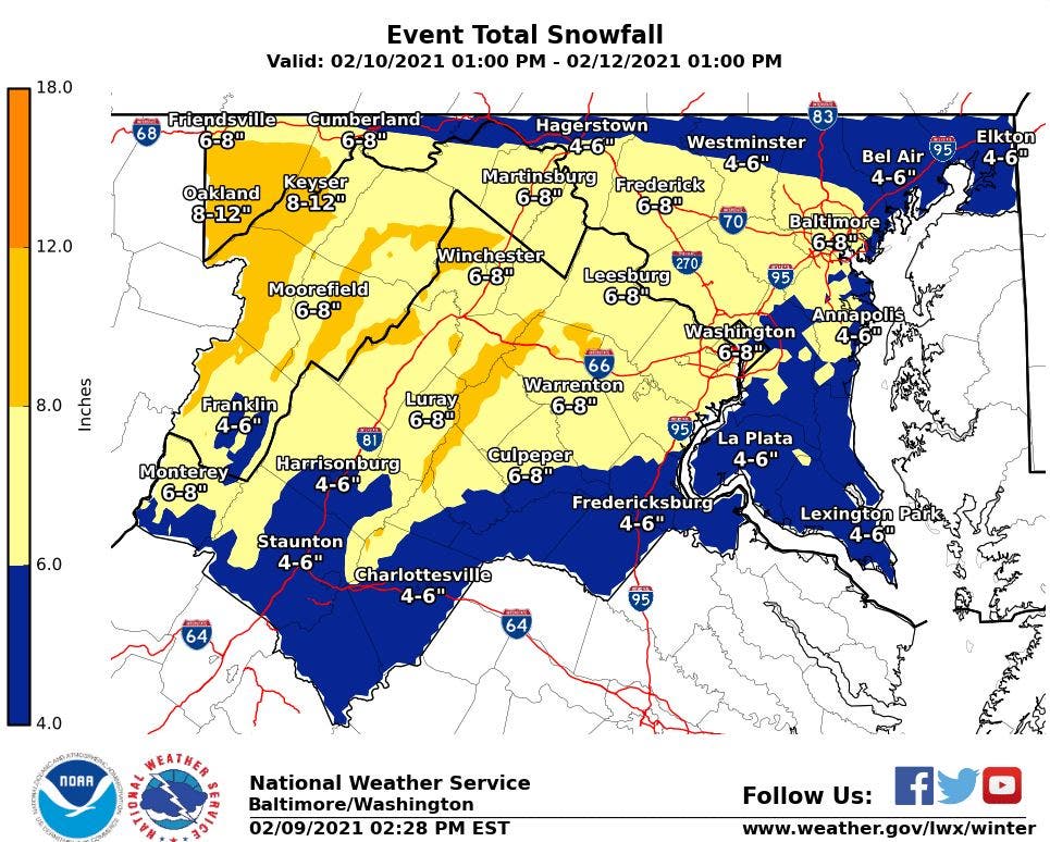For the Super Bowl Sunday storm, the highest snow totals for the Baltimore-Washington office's coverage area reached 6 or more inches along the Shenandoah Valley/I-81 corridor. Northern Virginia's localities had totals ranging from a trace in Arlington County to more than 4 inches in Loudoun County.