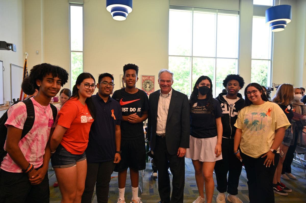 ARLINGTON, VA — U.S. Sen. Tim Kaine of Virginia met with students at Wakefield High School in Arlington on Monday to discuss gun violence and legislative measures that the senator hopes will be adopted to avoid another mass shooting like the one that happened at Robb Elementary School in Texas on May 24.