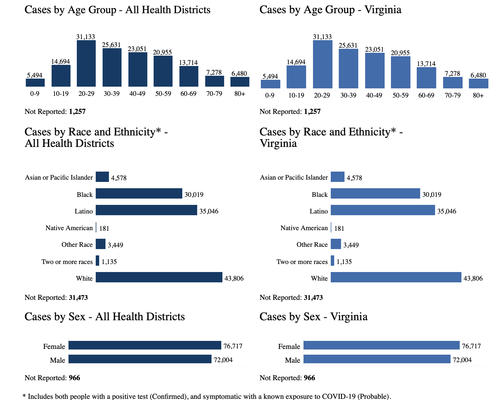 There have been 149,687 total cases statewide, according to data reported by the Virginia Department of Health. In Virginia, there have been 3,250 coronavirus-related deaths to date. There have been a total of 11,140 hospitalized COVID-19 patients.
