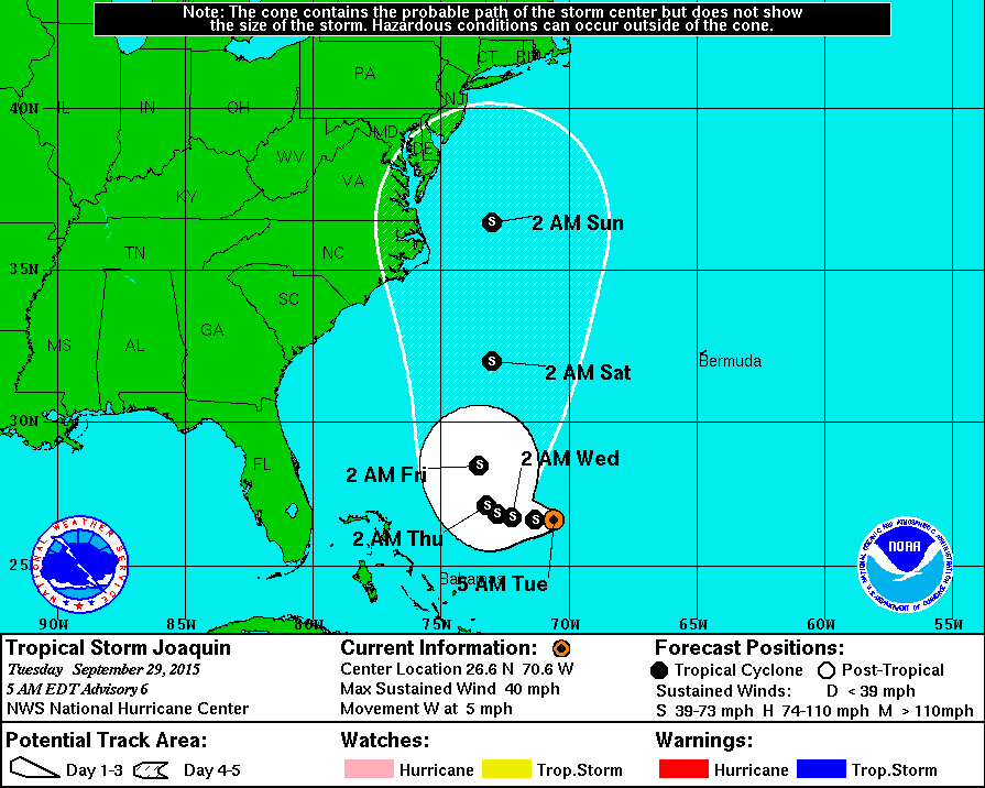 At 5 a.m., the center of the storm was located near latitude 26.6 North, longitude 70.6 West. Joaquin is moving toward the west near 5 mph, and this general motion is expected to continue through Wednesday. A decrease in forward speed and a turn toward the west-northwest are forecast by Wednesday night.