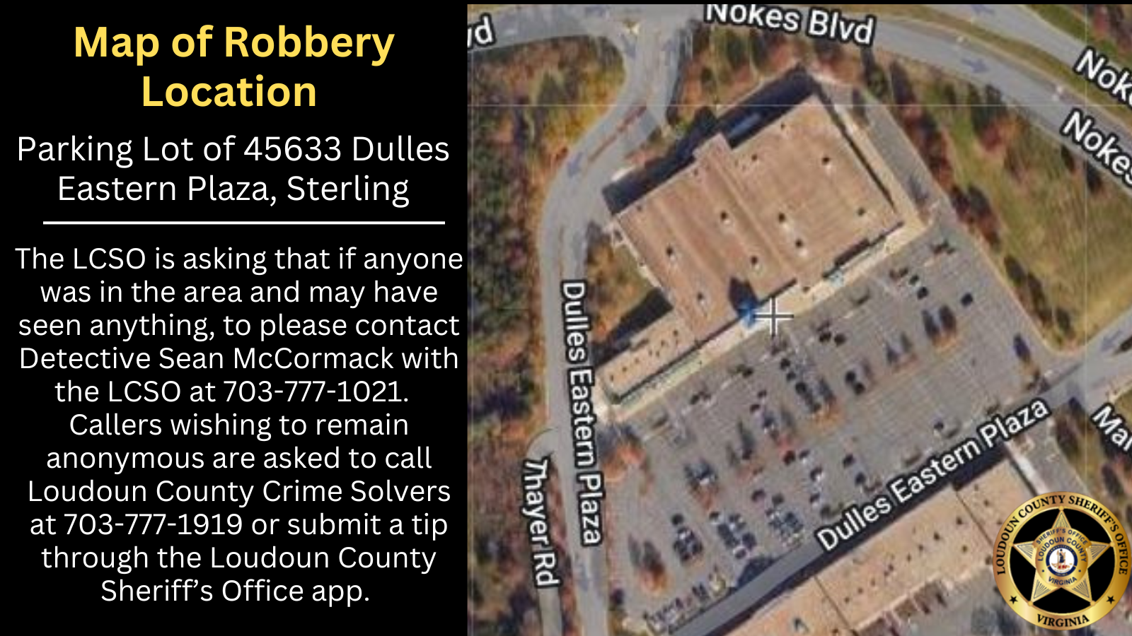 Anyone with more information about the robbery can contact Detective Sean McCormack with the Loudoun County Sheriff’s Office at 703-777-1021. Those wishing to remain anonymous can call the Loudoun County Crime Solvers at 703-777-1919.