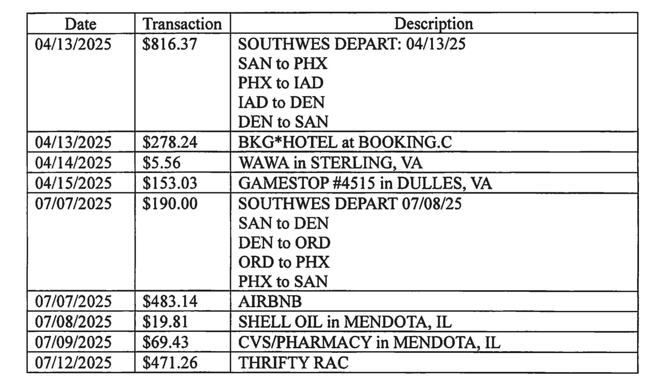 A record of the suspect's one credit card contained several transactions involving the purchase of airline tickets, hotel bookings and other expenses related to his two visits to Virginia and Illinois, according to the affidavit. The FBI also obtained records from the Best Western Dulles Airport and Hertz Rent-A-Car that included charges related to Valenzia's two trips.