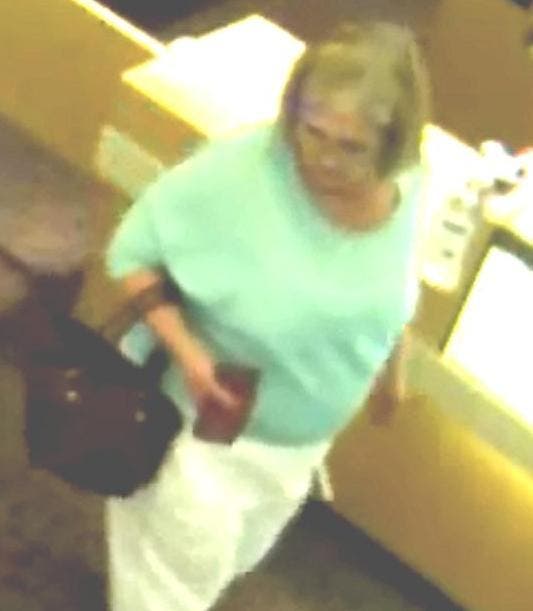 The suspect is described as a White female, upper middle-aged, with shoulder length blonde hair. She was wearing glasses and had on white pants, and a light green or blue shirt.