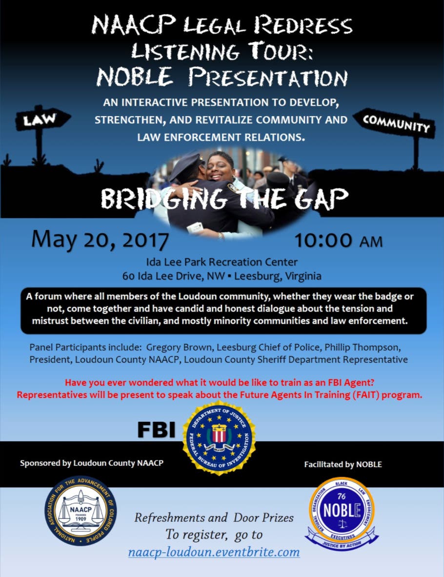 The event, which will be facilitated by The National Organization of Black Law Enforcement Executives (NOBLE) and sponsored by the Loudoun County NAACP, will be led by a three-person panel: (1) Gregory Brown, Leesburg Chief of Police; (2) Phillip Thompson, President of the Loudoun Co. NAACP; and (3) a representative from the Loudoun Co. Sheriff’s Office.