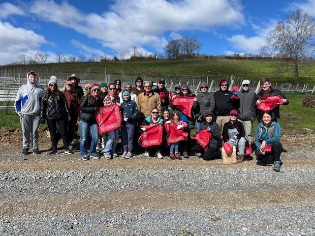 "I was amazed at the community outpouring that came to help save our vineyards from Spotted Lanternflies," Bluemont Vineyard winemaker Scott Spelbring said in a statement. "Though it was cloudy and cold, our volunteers were complete rockstars. Seeing the sea of volunteers in red bandanas across the vineyards was heartwarming."