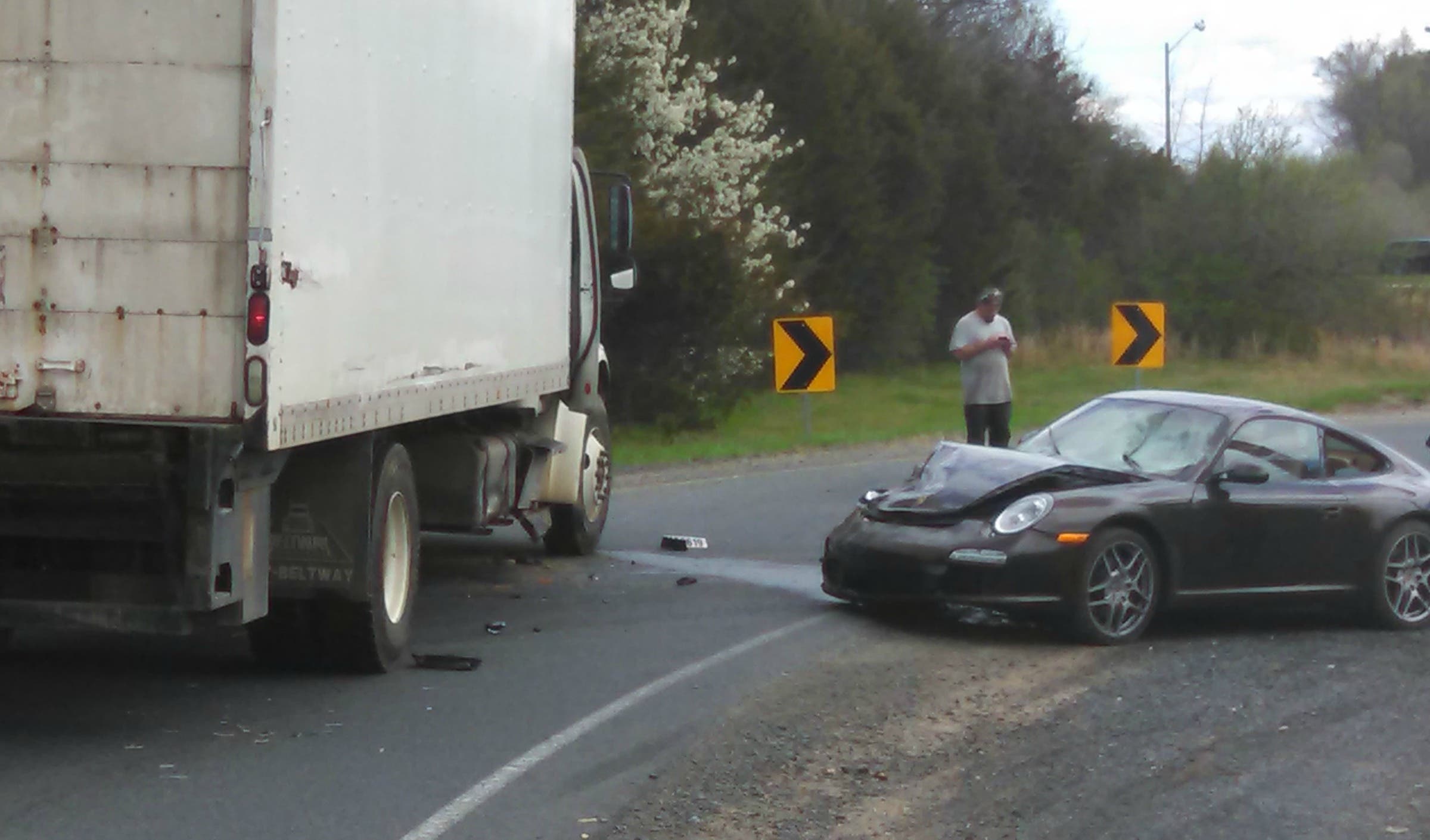 One of the vehicles, the Porsche, took the same exit and tried to get around the truck by driving on the shoulder.
