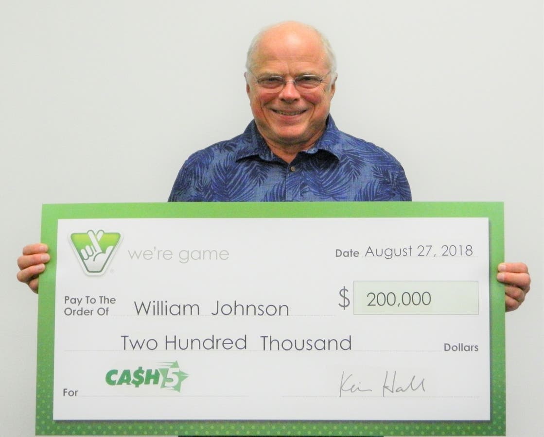 Namely, he won $200,000 in the Virginia Lottery's Cash 5 game. Johnson used the same numbers on both tickets, and thus claimed two top prizes of $100 grand apiece.