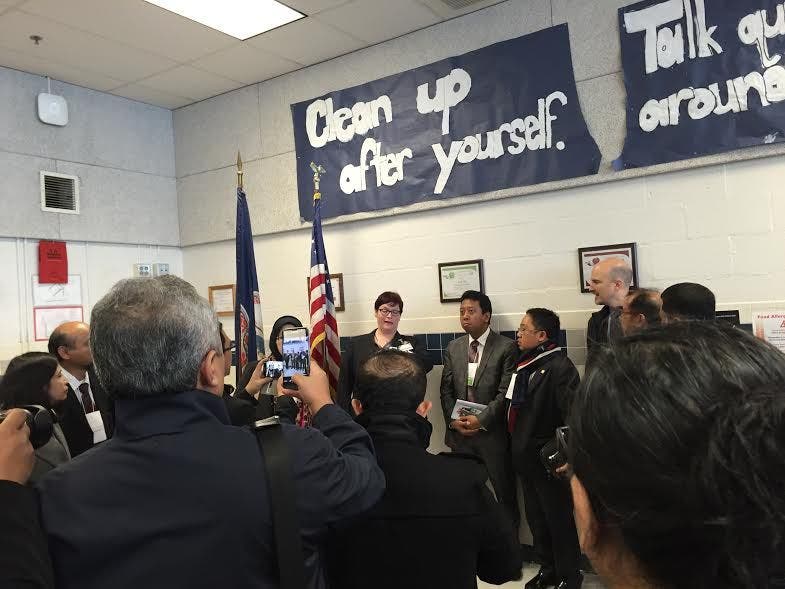 They took pictures, took notes and more or less took in the relatively mundane process that these things usually are: a long line of patient folks amid banners urging students to eat healthily and mind their manners.