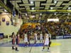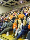 Enthusiastic fans cheer on the Spartans and the Rams.