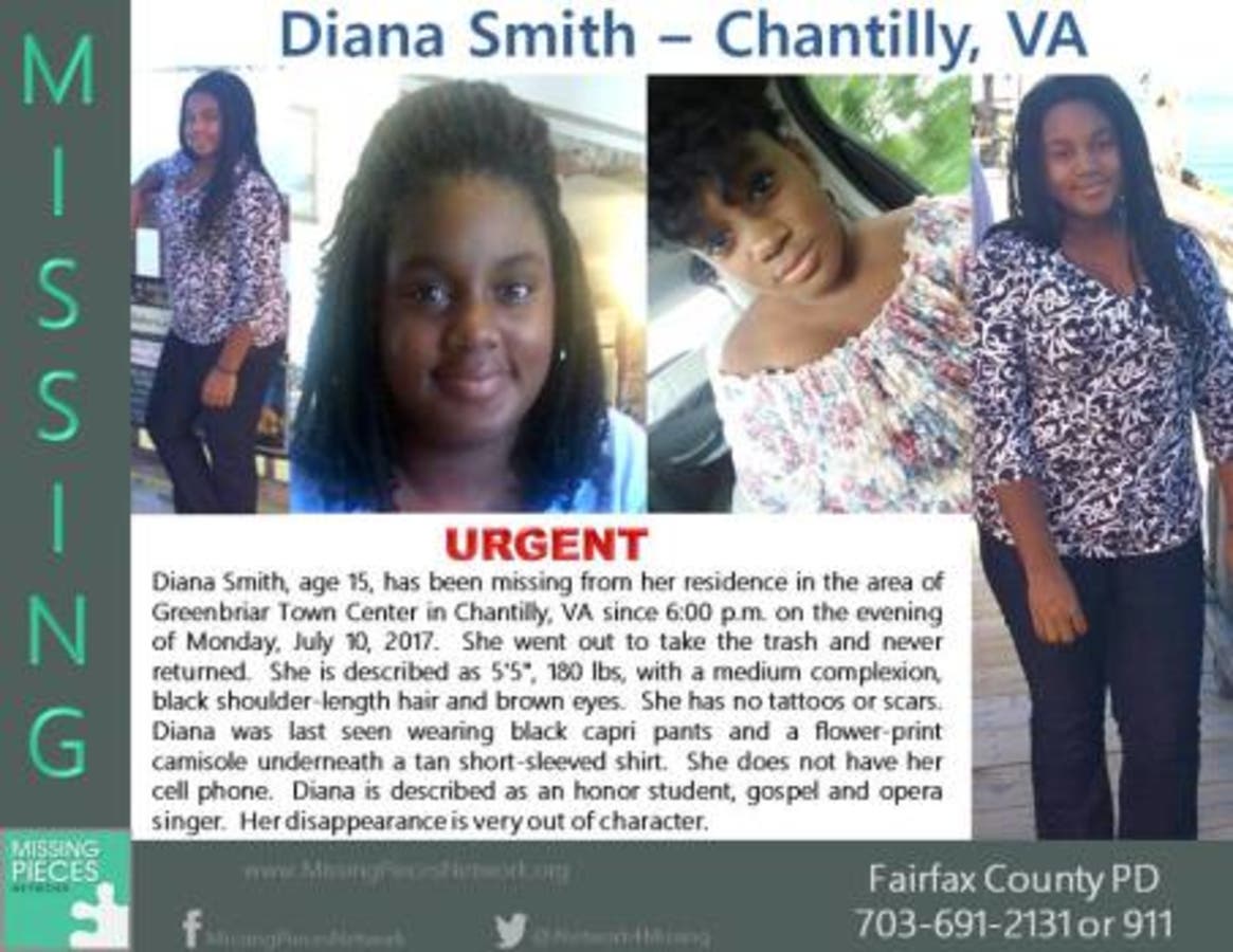 Diana Smith, a 15-year-old honors student that disappeared from her Chantilly home on Monday, was found.