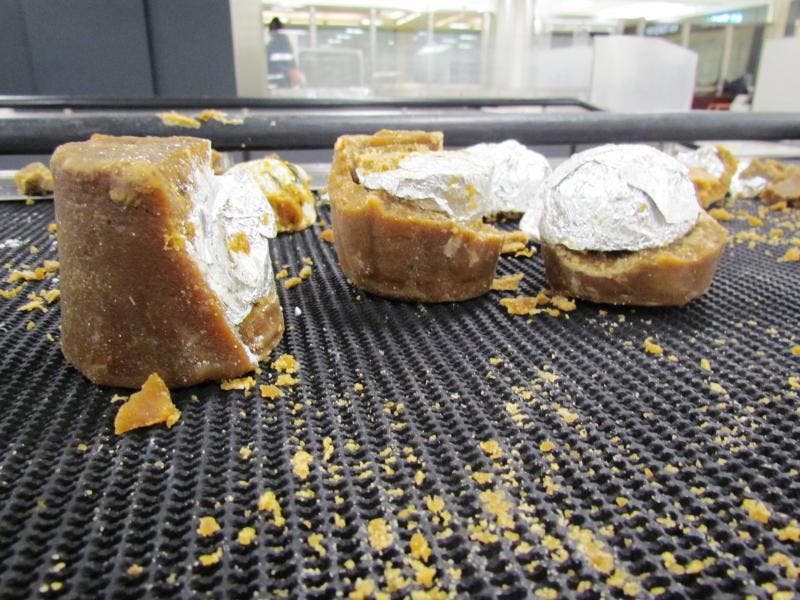 Among other things she was carrying, CBP officers discovered a brown cone-shaped package wrapped in cellophane. The woman stated they were caramelized sugar cane sweets originating in Honduras. A CBP officer probed one of the sweets with a knife and discovered a white, powdery substance on the blade that field-tested positive for cocaine. CBP officers inspected the rest of the sweets and were able to extract the cocaine from all eight pieces. The total weight of the cocaine was slightly less than 1 pound, 10 ounces. This cocaine could have a street value of more than $80,000.