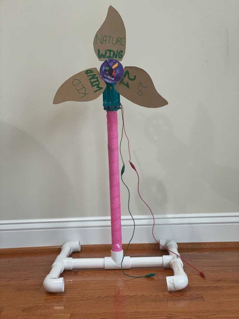 For the final version of the project, the turbine blades were made of thin cardboard. The team at the KidWind Challenge provided Pranamya with the parts to create the gearbox portion of the wind turbine. And then she used PVC pipe to construct the tower and base.