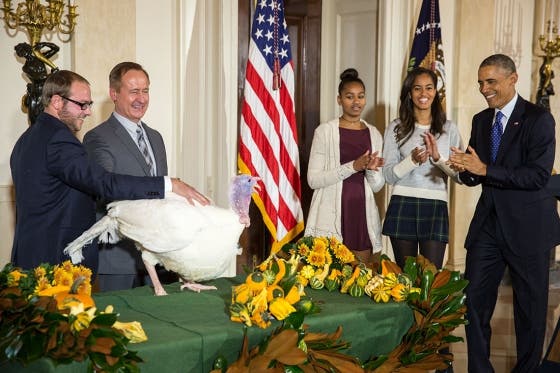 PHOTO: President Barack Obama, daughters Sasha and Malia, National Turkey Federation Chairman Gary Cooper; and son Cole Cooper participate in the annual National Thanksgiving Turkey pardon ceremony Wednesday in the Grand Foyer of the White House. (Official White House Photo by Chuck Kennedy)
