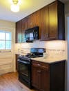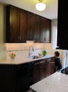 The room is incredibly bright. Dark brown cabinets and black appliances are contrasted with white granite countertops, white tiled backsplash and undermount lighting. This once dingy kitchen is now a shining star.