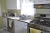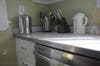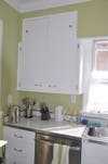 Michelle kept the original cabinets and the counter tops. The cabinets got a good sanding, a fresh coat of white paint and new brushed chrome hardware. I love how the counter tops, quite possibly original to the house, are in near pristine condition. Very charming—and they look like they were meant to be next to the stainless steel appliances.