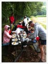 An intense thunder and lightning storm woke the campers early the next morning, and filled Josephine and Esme's tent with puddles of water. They were soggy but excited when we arrived to eat breakfast with them. Like last year, my father put Esme to work cracking eggs and Josephine set the table (my nephew left early and Desmond was having trouble getting changed out of his pjs).