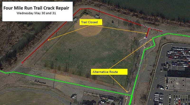 A portion of the Four Mile Run Trail will be closed Wednesday May 30-Thursday, May 31 for repairs.