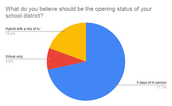 When asked which school reopening option they'd choose, the top choice wasn't hybrid learning. The survey found 71.7 percent of respondents prefer five days of in-person learning per week. Hybrid learning received support from 19.4 percent of respondents, and virtual learning got 9 percent.