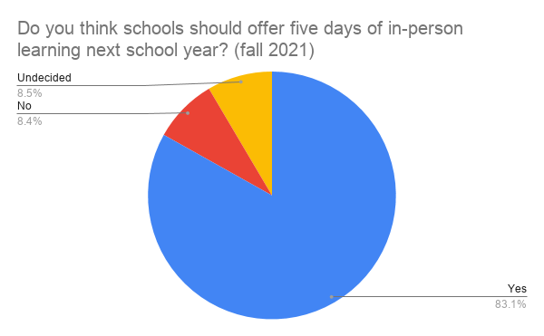 Support for five days in schools was even stronger when respondents were asked about the 2021-2022 school year. A total of 83.1 percent support five days of in-person learning each week in the fall and 8.4 percent do not support it. The remaining 8.5 percent are undecided on whether five days of in-person learning should be offered.