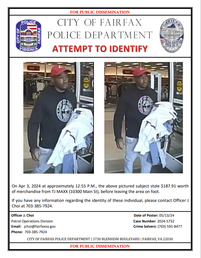 Anyone with information about the man in the surveillance photos is asked to contact Officer J. Choi of the Patrol Operations Division at jchoi@fairfaxva.gov or 703-3385-7924. Anonymous tips can be submitted to Crime Solvers at 703-591-8477.