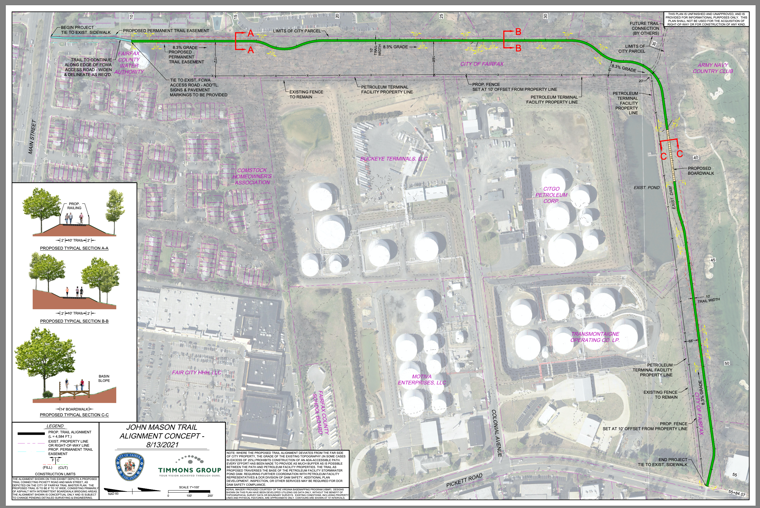 As it is currently planned, the John Mason Trail project, which is part of the city's Two-Year Transportation Program, would create a "scenic off-road shortcut" from Pickett Road to Main Street, according to the city. The trail would begin north of Colonial Avenue, head west and south around the tank farm, and connect with Main Street east of Lyndhurst Drive.