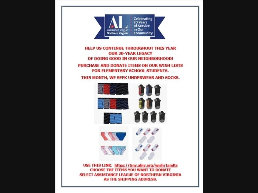 Throughout 2024, Assistance League of Northern Virginia will have monthly opportunities for friends and supporters to help celebrate its 20th anniversary as a chapter by purchasing items from its wish lists. Your donations will ensure that the nonprofit can continue its philanthropic programs. In January, Assistance League is featuring its Tushies and Toes wish list to provide much-needed underwear and socks for the elementary school students it serves. Special thanks to all the supporters who have already purchased items from the wish lists and helped Assistance League’s 20th-anniversary celebration get off to a great start. To help with this month’s campaign, use this link https://tiny.alnv.org/wish/tandts and choose the items you want to donate. Please select Assistance League of Northern Virginia as the shipping address to ensure prompt delivery.
