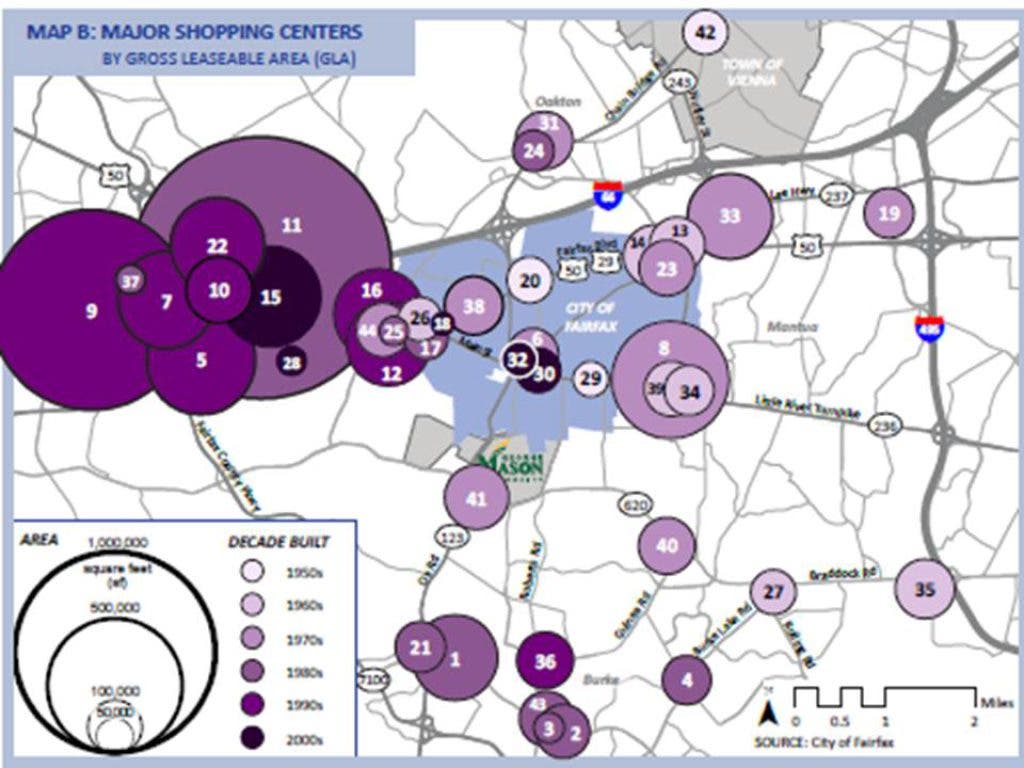 So far, two briefing papers have been published, out of eleven. The first, “Comprehensive Plan Mechanics” is just an explanation of the masterplan format. The second, “Regional Development Snapshot” explains how regional land use can impact the city in the future. It is full of information about the status of primarily commercial land from Merrifield to Fair Lakes. It conveys a lot of information that people generally know, but backs it up with graphics. For example, everyone knows that Fair Lakes is a huge shopping destination, but the graphics make it clear just how large compared to shopping areas in the city.