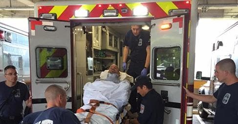 Image: Fire and rescue personnel help transport Darrell Hees, a Canadian policeman (Ron Kuley, Fairfax County Fire & Rescue Department).