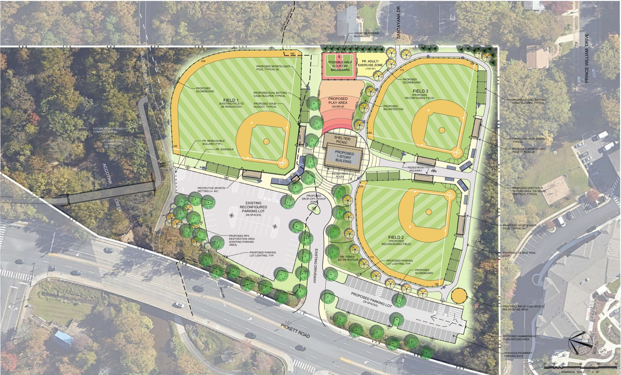 The 12-acre park located a 3401 Pickett Road consists of five baseball diamonds, a playground, and a two-story building that was constructed in 1997, which used primarily by Fairfax Little League. In addition, a large parking lot serves city employees and visitors to the nearby Gerry Connolly Cross-County Trail.