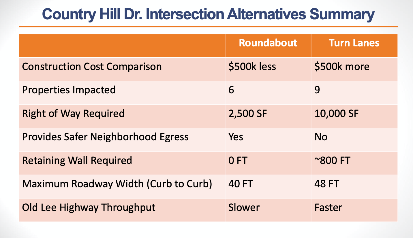 In its report, city staff noted that the roundabout would fit within the existing paved area at the Country Hill Drive intersection. The city would only need to acquire a minimal amount of the 2,500 square feet of right of way necessary to install the roundabout. Only six residential properties along Old Lee Highway would be impacted.