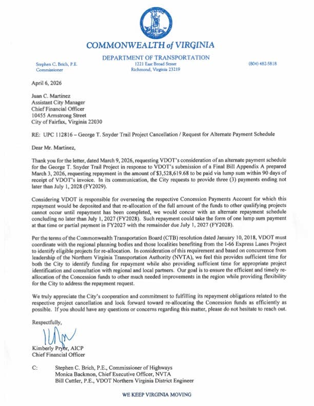 VDOT requests $3.5 million from Fairfax City following the George Snyder Trail cancellation, while offering to coordinate on repayment.