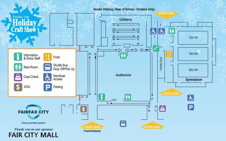 The 2019 Holiday Craft Show will be spread throughout several areas of Fairfax High School. The map below illustrates where parking, entrances, coat check, vendors, food and restrooms are located.