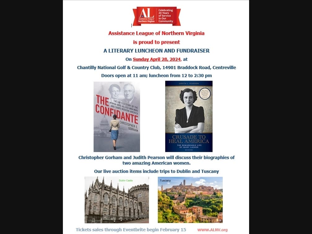 Assistance League of Northern Virginia’s spring luncheon is just three months away and it continues to add elements to make the event even more enticing. On April 28, the organization will present A Literary Luncheon and Fundraiser at the Chantilly National Golf and Country Club. The featured authors – Judith Pearson and Christopher Gorham – will discuss their recent biographies of two women who had a significant impact on mid-century America and beyond. A fireside chat will follow where guests can ask them questions. The luncheon program runs from noon to 2:30 pm, and guests can arrive starting at 11 am to register, meet the authors, buy their books and have them signed, and review and bid on the fabulous silent auction items.