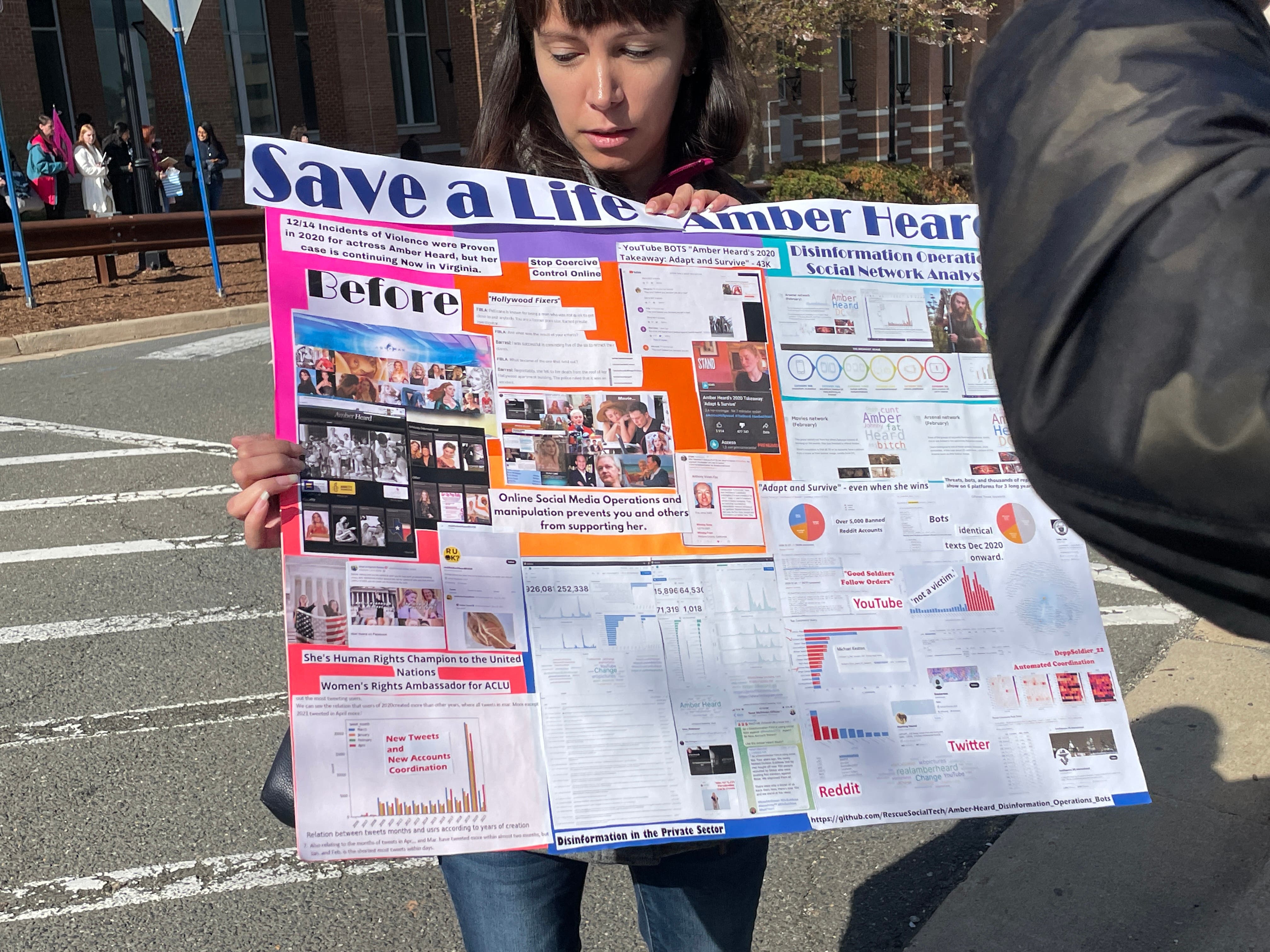 Christina Taft, a Los Angeles data scientist and social media for good activist, showed a poster she had created to the reporters waiting outside the courthouse. She claimed Heard was a victim of an organized social media campaign meant to undermine the actress's story.