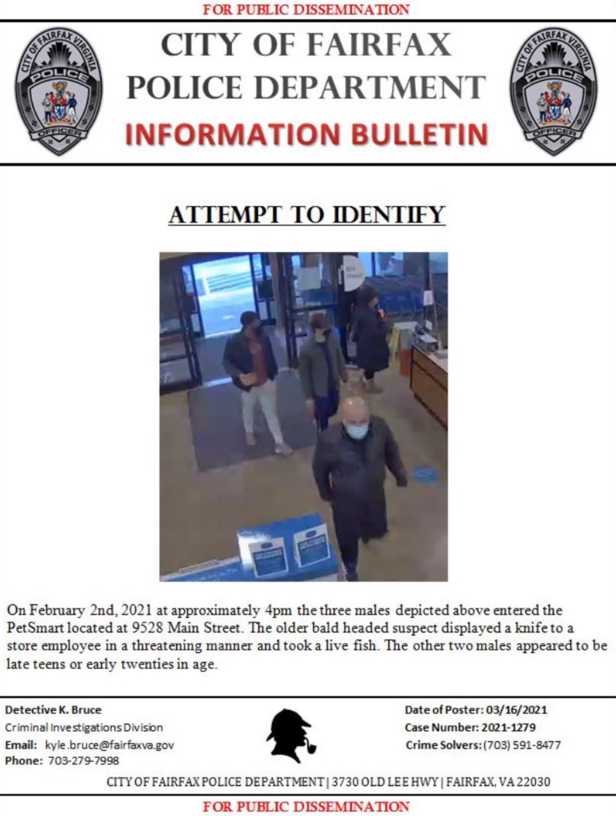 Anyone with information about this case or the identities of the three men is asked to contact Detective Kyle Bruce of the Criminal Investigations Division by phone at 703-279-7998 or email at kyle.bruce@fairfaxva.gov. Information may also be submitted by calling Crime Solvers at 703-591-8477.