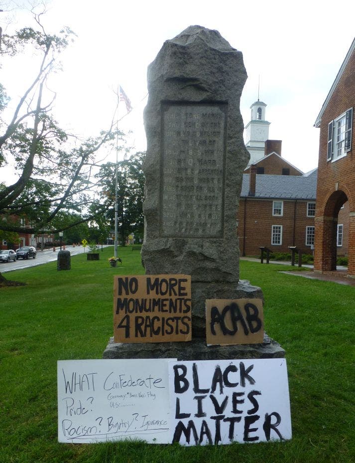 The protesters who gathered in downtown Fairfax hope the same change comes to the John Quincy Marr monument on the grounds of the old Fairfax County Courthouse. Although not as grand as the Robert E. Lee statue on Monument Avenue in Richmond, the Marr monument demonstrates to the Fairfax community that local leaders still view a Confederate officer as an important person who must continue to be honored, one of the protesters said.