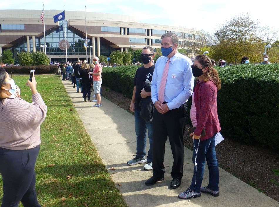 Warner told the voters, all of whom were wearing masks, that the Fairfax County in-person absentee voting line was one of the largest gatherings he has attended on the campaign trail due to his inability to hold campaign rallies because of the pandemic.