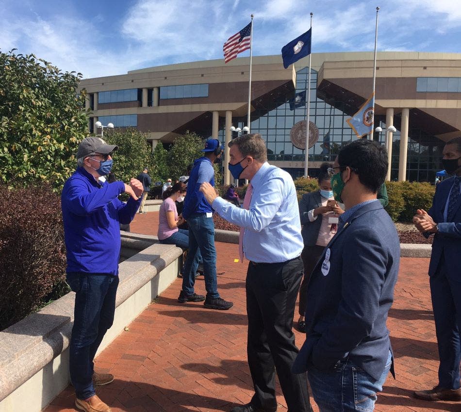 FAIRFAX COUNTY, VA — Hundreds of people lined up outside the Fairfax County Government Center Friday to vote in the 2020 general election, giving Sen. Mark Warner (D-VA), who is seeking a third term in office, a captive audience to introduce himself to voters and discuss issues.