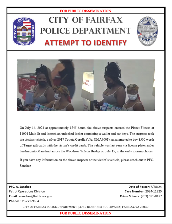Around 6:45 p.m., on July 14, two people entered Planet Fitness at 11001 Main St. and unlocked a locker containing a wallet and car key, according to police. They then took the victim's vehicle, a silver 2017 Toyota Corolla with Virginia tags: UMA9001, and tried to purchase $500 worth of Target gift cards using the victim's credit cards.