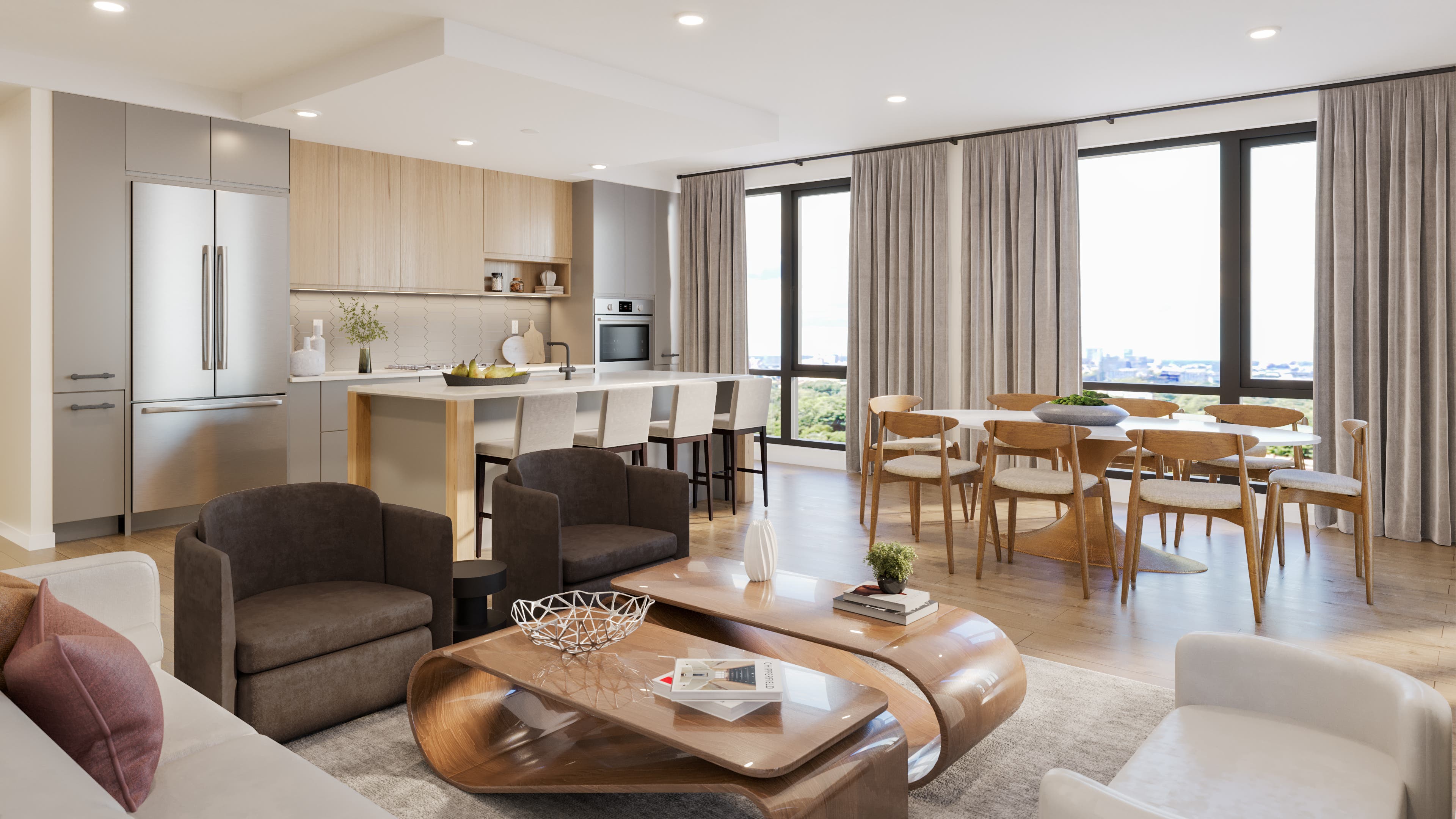 The condominium, designed by SK+I Architecture, will offer one-bedroom, two-bedroom and three-bedroom units, including penthouses. Units will have open layouts, spacious living and bedroom areas, kitchens with islands, European-inspired cabinetry, Porcelanosa wide-plank wood-style flooring, bathrooms with porcelain and quartz finishes, hotel-style vanity mirrors with backlighting and expansive windows. Most units will have terraces or balconies.