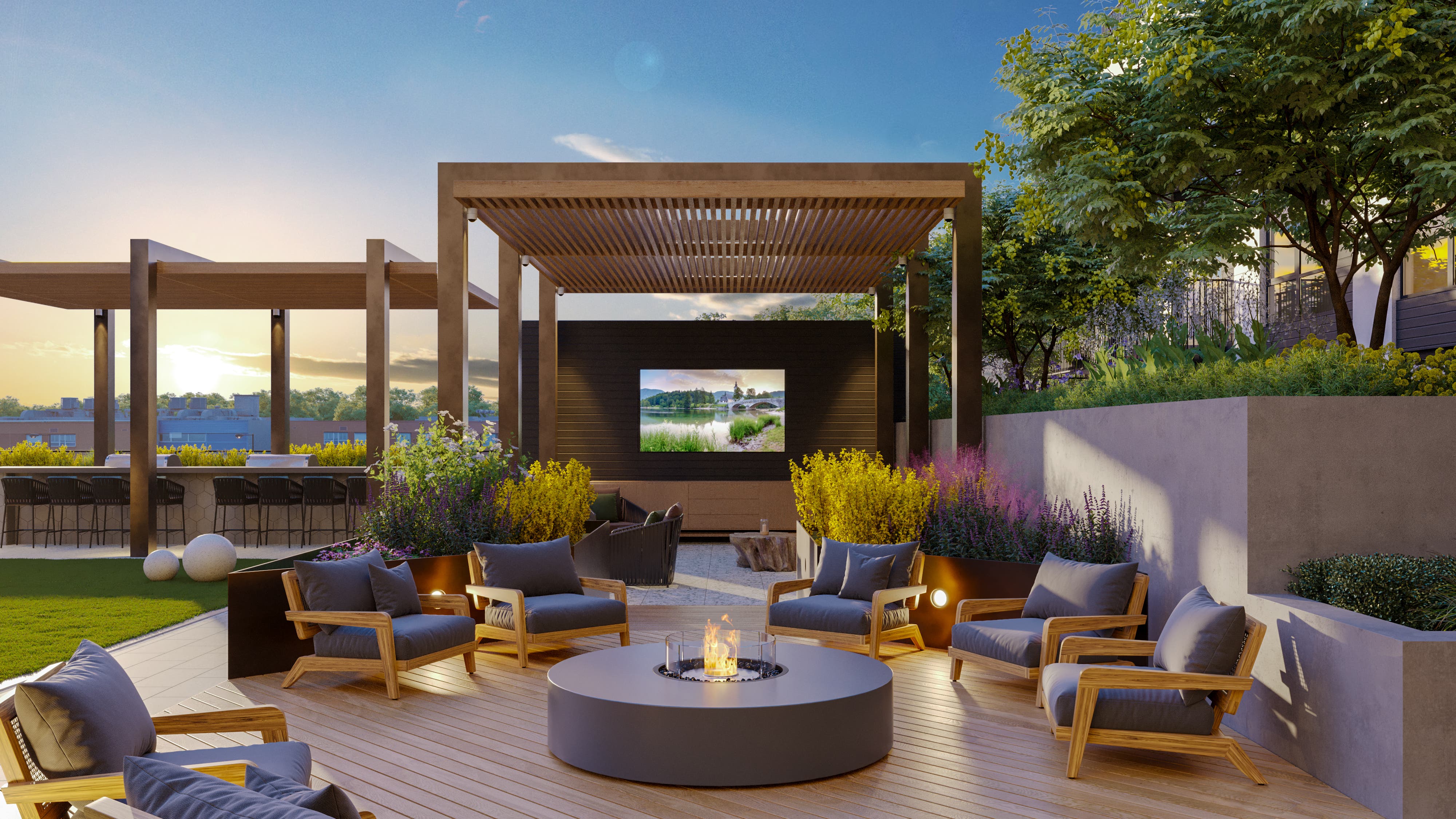 Residents will have access to amenity spaces like a fitness center, pet spa, bike storage and residents’ lounge with a communal dining table, lounge seating, fireplace, wet bar and built-in coffee machine for entertaining. Outside, residents will enjoy a second floor terrace with greenery, dining areas, an outdoor kitchen with grills, a lawn, a pergola, seating areas, TV and a fire pit. The community is expected to get LEED Gold certification for environmentally-friendly standards like LED light fixtures, Energy Star appliances, integrated green roofs and bioretention areas.