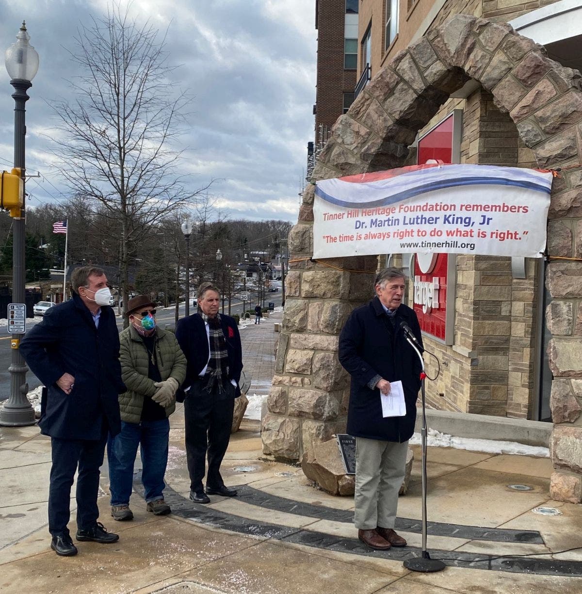 FALLS CHURCH, VA — U.S. Sen. Mark Warner and Rep. Don Beyer joined Edwin Henderson II, founder of the Tinner Hill Heritage Foundation, on Monday to celebrate the birthday of Martin Luther King Jr. with nearly 100 other people at the Tinner Hill Civil Rights Monument in Falls Church.