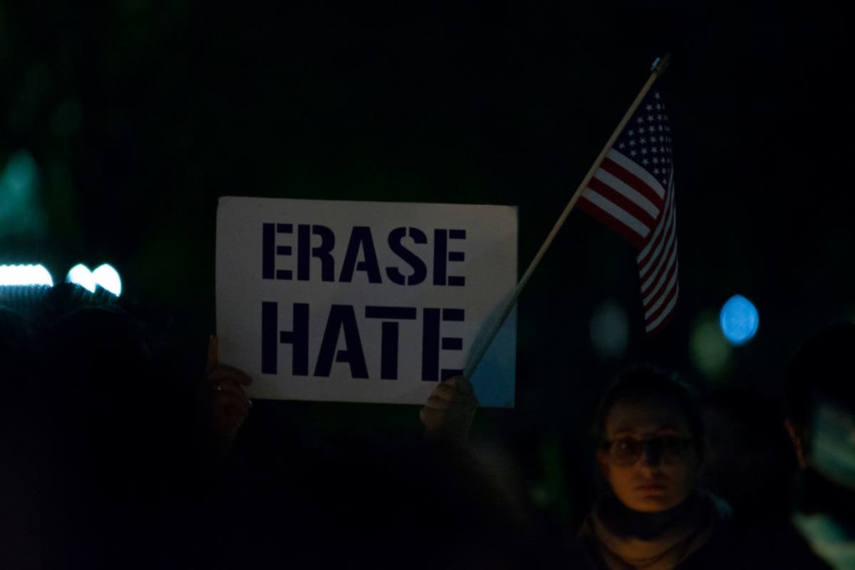 PHOTO: A vigil participant holds a 'Erase Hate' sign during a Havdalah vigil for the victims of the Tree of Life Congregation shooting in front of the White House on October 27, 2018 in Washington, DC. (Photo by Alex Edelman/Getty Images)