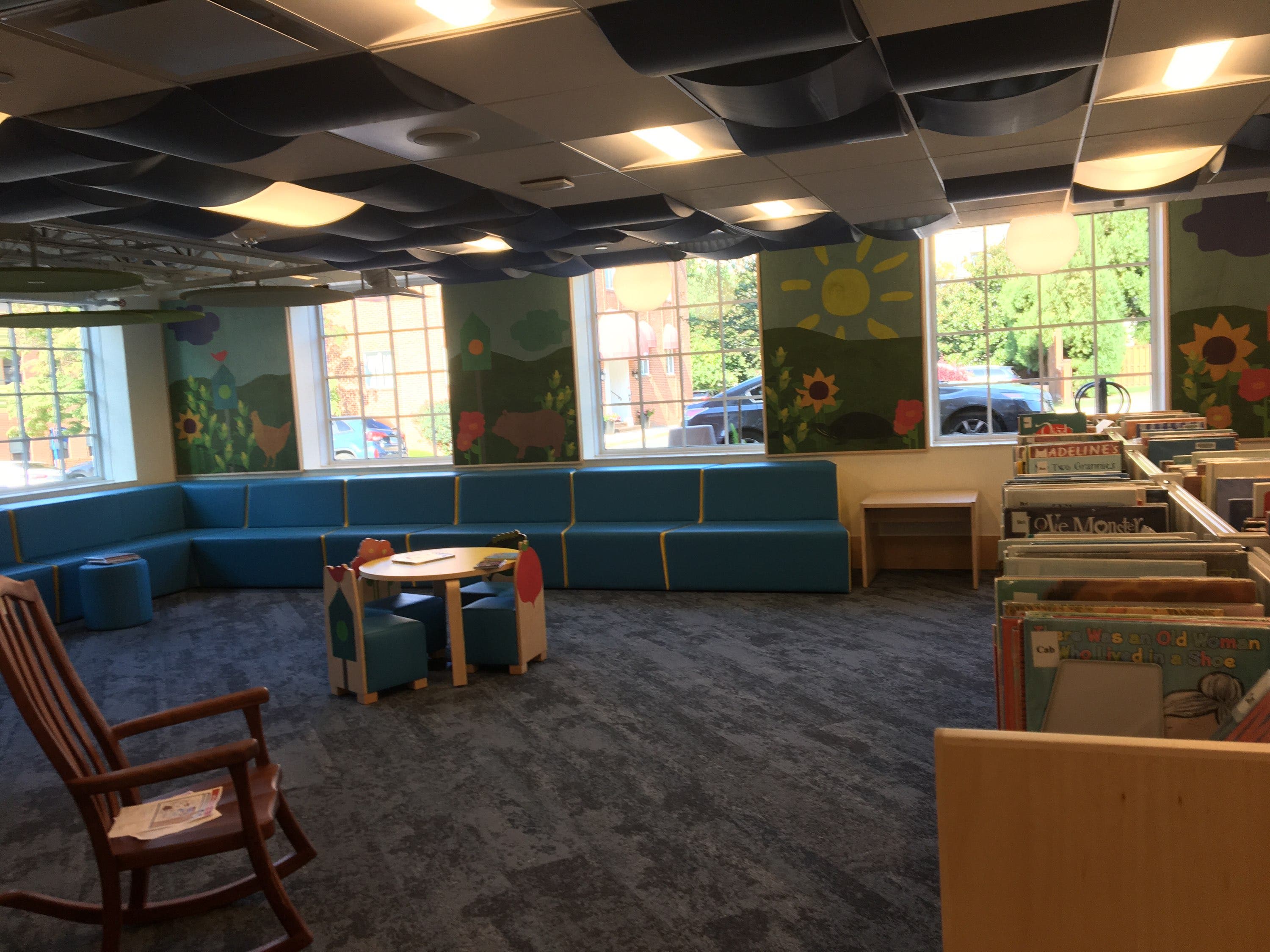 The upper level hosts adult fiction, nonfiction and periodicals, an Adult Reading Room, a conference room and the Falls Church History Room. New items are featured along the front, and an elevator is located near the front entrance. The lower level has teen and children's sections, a teen room, two group study rooms, a conference room, computer stations and a kids reading area.