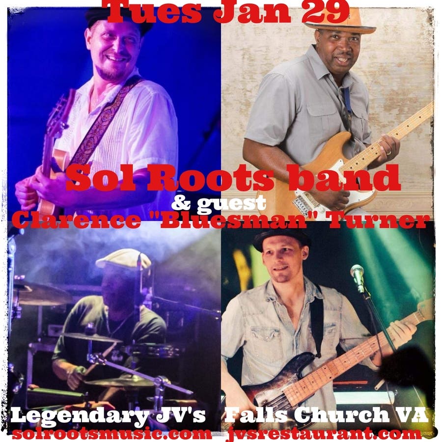 A special concert of funk, soul, rock and blues. Sol Roots band with guest Clarence Bluesman Turner perform in Northern Virginia Tues Jan 29