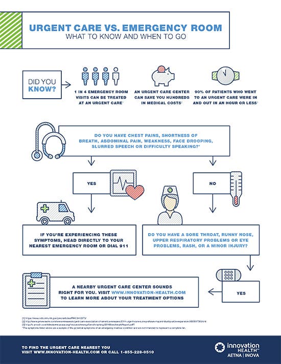 Once you decide which is right for you, it’s time to get you feeling better! Inova has 15 urgent care centers in Northern Virginia that are open 7 days a week with no appointment required. Find your nearest urgent care center here. And if your symptoms require care at an ER, you can use the Inova app to find your nearest ER and check wait times.